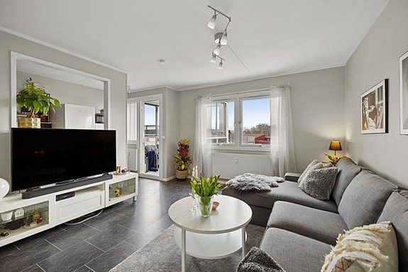 Stue er lys og tiltalende med utgang til solrik innglasset balkong på 9 m2. Nyere innvendig solavskjerming. Fra balkong er det flott utsikt mot sør.