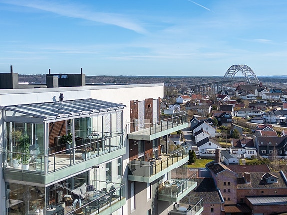 Dette er en romslig og lys 4-roms leilighet med høy komfort. Leiligheten ligger øverst i bygget med storslagen utsikt over byen, den ikoniske Fredrikstadbroen, Hvaler-øyene og videre Sverige i syd og Gressvik i vest. Innendørs er det valgt tidløse interiør- og fargevalg som gir den rette følelsen av modernitet og god standard. Leiligheten har en velfungerende og praktisk planløsning med åpen stue- og kjøkkenløsning med en lekker gasspeis med iøynefallende plassering og utgang til en romslig innglasset balkong, ca. 17 m². Leiligheten har videre tre soverom, to pene bad, bod og entré. Eier har to innendørs biloppstillingsplasser med elbillader og en romslig sportsbod i felles garasjeanlegg. Det er heis i bygget. Bryggerifjellet ligger på en fjellkam på nordsiden av Fredrikstad sentrum. Herfra er det ca. 10 minutters gange til Fredrikstad sentrum med handlegater, kjøpesentre, matbutikker, restauranter og jernbanestasjon like ved på Cicignon. Dette er et populært og rolig område.