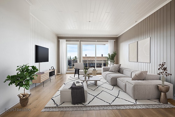 Romslig stue med store vinduer som gir mye naturlig lys - Bildet er digitalt stylet