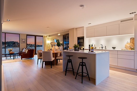 Nyoppført townhouse idyllisk til v/sjøen, perfekt som både feriebolig/helårsbolig. M/2 P-plasser i garasje og 1 båtplass gjør dette boligen komplett. Fantastisk beliggenhet m/tre uteplasser, inkludert en romslig og solrik takterrasse på 46 kvm med imponerende utsikt over sjøen. Boligen er fordelt over 4 etasjer, med moderne design og høykvalitetsmaterialer som eikegulv og store vinduer som gir mye lys og fantastisk utsikt. Kjøkkenet er utstyrt med hvitevarer fra Miele og stilren innredning fra Uno Form.