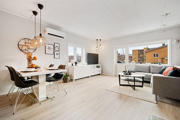 Leiligheten har en lys og flott stue på 22 kvadratmeter. Store vindusflater gir rikelig med lys og luft.