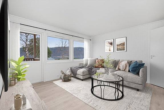 Lys og pen 2-roms leilighet beliggende i et veletablert boligområde på Kyrksæterøra. Her bor du med kort vei til sentrum med et stort utvalg servicetjenester. Bildet viser stua med digital møblering.