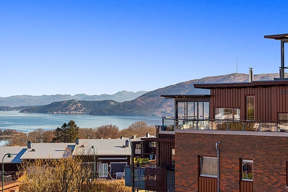 Stor hjørneleilighet med 3 soverom, takterrasse, hagestue og en fantastisk utsikt. Heis og parkering i lukket anlegg