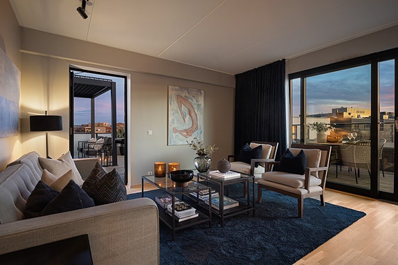 Leiligheten byr på en lys og luftig stue med utgang til to fantastiske takterrasser, hvor du har sol fra morgen til kveld! Kjøkkenet er delikat og stilrent, og ligger i åpen, men tilbaketrukket løsning. Boligens hovedsoverom er romslig og innbydende og har tilgang til privat, "ensuite" bad. To ekstra soverom, hvorav et av de har utgang til en egen balkong.