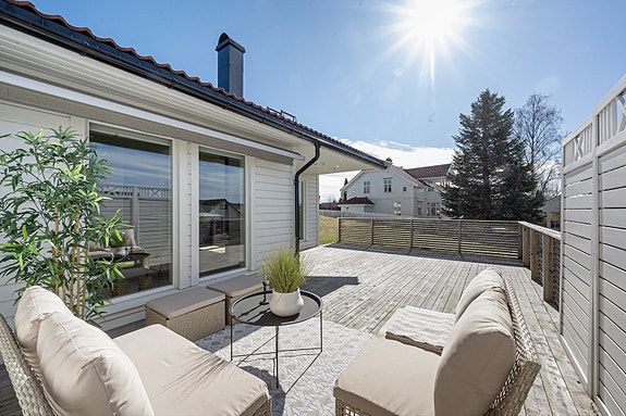 Utgang til stor terrasse hvor man kan nyte solrike dager.