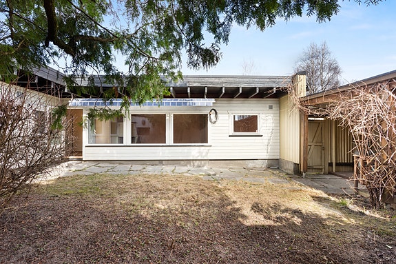 Disse vakre atriumshusene på Ammerud er sterkt inspirert av japansk byggeskikk, med fokus på enkelhet, balanse og en sømløs forbindelse mellom ute- og innerom. Arkitekt Håkon Mjelva, kjent for sin evne til å skape boliger i tett dialog med omgivelsene, hentet mye inspirasjon fra japansk arkitektur. Boligen er over 2 plan og har i dag en ikke ferdigstilt kjeller, som ikke er godkjent for varig opphold.
