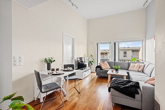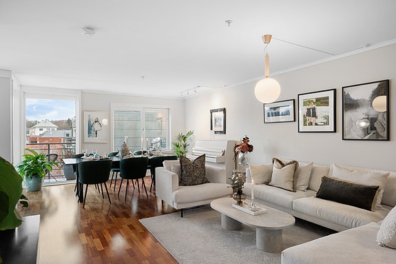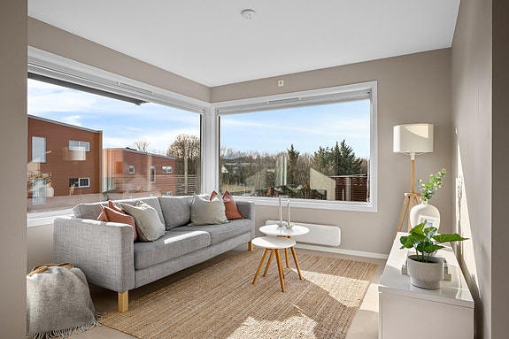 Stuen har store vindusflater og ekstra takhøyde noe som gir rommet et lyst og luftig preg.