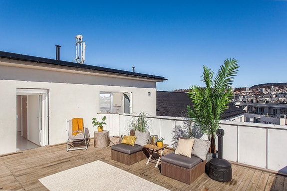 Pen toppleilighet m/direkte adkomst til en stor solrik felles takterrasse - Heis -"Alt" inkl. i fellesutg. - Nær BI