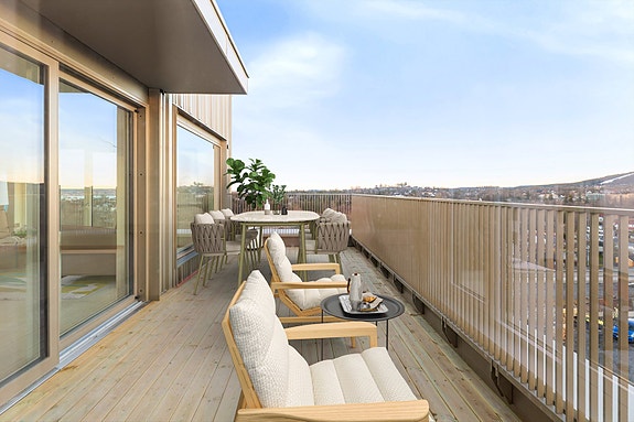 Privat takterrasse på ca. 22 kvm. Utsikt fra på toppen av bygget i 5. etasje. Foto: Walso Work. Bilder i annonsen er digitalt stylet.