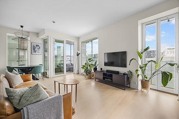 Nydelig 3-roms fra 2016 | God planløsning | To balkonger -23 m² | V.vann, fyring og internett inkl. | Felles takterrasse