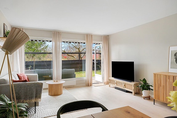 - Stor markterrasse på hele 13 m² + hageflekk. Sol fra ca. 13-21