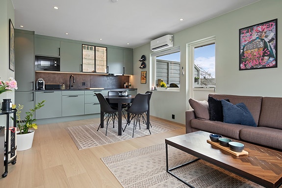 Stuen er åpen med ny varmepumpe og fint lysinnslipp fra to sider, der kjøkkenet har god skapplass og alle hvitevarer integrert. Dagene får en fin start på et lekkert bad med gulvvarme, regnfallsdusj og opplegg for vaskemaskin. Begge soverommene har et åpent garderobeskap, og to eksterne boder gir rikelig med lagringsplass. Velkommen!