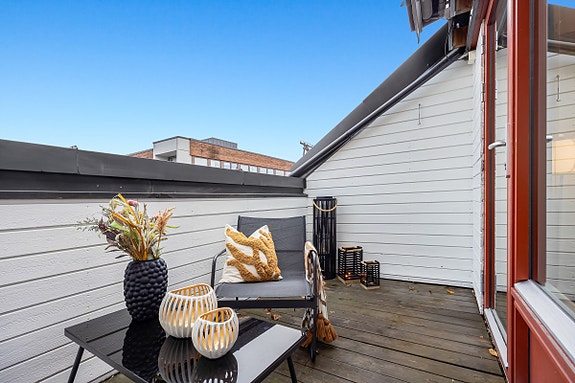 Nå som våren er her er den store balkongen plassen å sitte. Her har man fint utsyn mot bakgården og deilig kveldssol.