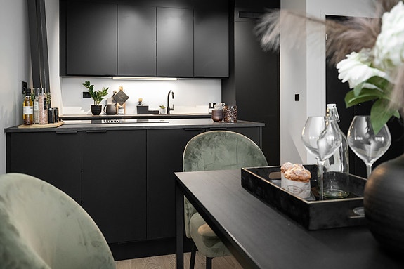 Det elektriske anlegget ligger generelt skjult i leiligheten med unntak av lyd- og betongvegger. Det er stikkontakter i svart. Lysbrytere, med unntak av bad, er trådløse i svart utførsel. Det er LED downlights m/dimmer i entre/gang og hovedbad. I kjøkken er det spotskinne med 4 spot i tak. I tillegg er det LED lyslist under overskap på kjøkken. Øvrige rom er forberedt med lyspunkt i himling eller stikkontakt i overgang mellom tak og vegg inkl. lysbryter. Det er montert en lampe og stikkontakt på balkong og en lampe ved inngangsdør. Sikringsskap er plassert i leilighetens entre/gang. Vann og fjernvarme (sanitaranlegg). Ett-greps blandebatteri på alle vasker og termostatstyrte dusjbatterier inkl. dusjgarnityr. Opplegg for vaskemaskin på bad, oppvaskmaskin tilkoblet i kjøkkenbenk.