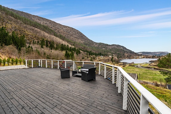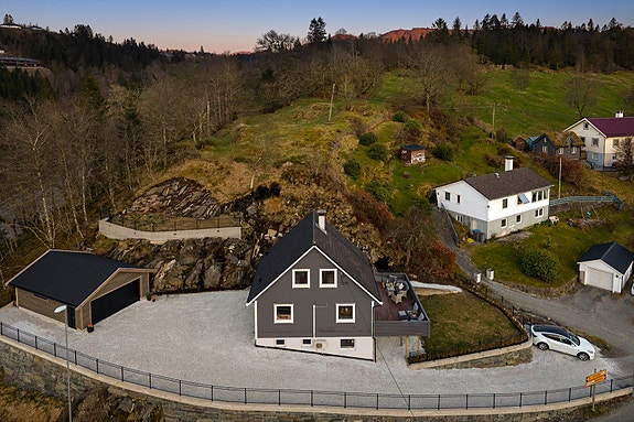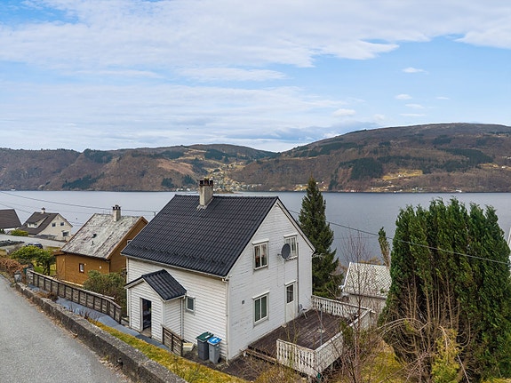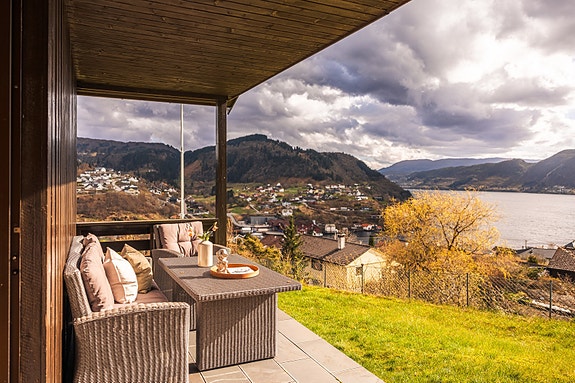 Bare 3 minutter unna fergekaien ligger denne flotte familieboligen med stor og solrik hage, fantastisk sjøutsikt og parkering i garasje.