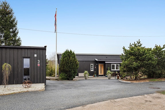 Dette er en flott og påkostet enebolig over ett plan med en gjennomtenkt planløsning. Boligen inneholder en romslig entré, to moderne bad med gulvvarme, to (tre) komfortable soverom, et velutstyrt kjøkken og en lys stue med imponerende takhøyde. Den solrike tomten byr på vakker utsikt og er pent opparbeidet med hage og flere innbydende uteplasser. I den asfalterte gårdsplassen finner du både enkel- og dobbelgarasje, hvorav en har elbillader.