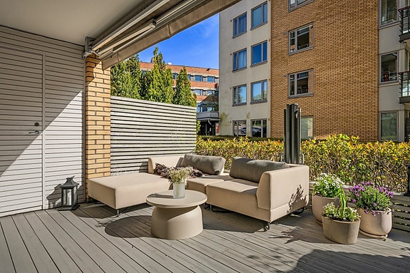 Stilren 2-roms selveierleilighet med attraktiv og tilbaketrukket beliggenhet innerst i en blindvei, helt skjermet for trafikk. Leiligheten ligger i bygård fra 2006 og holder en høy standard med flere oppgraderinger senere årene som bl.a. 1-stavs eikeparkett, sparklede og malte overflater og påkostet kjøkken i delvis åpen løsning mot stue. Det er rikelig med garderobeplass på soverom og i entré/gang. Fra stuen er det utgang til en stor, solrik markterrasse på ca. 19m² med flere møbleringsmuligheter.