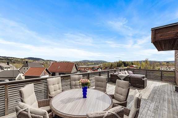 Her får du en en innholdsrik familiebolig i et hyggelig og nyere etablert boligområde med barnefamilier. Boligen holder gjennomgående god standard og har en meget god intern beliggenhet på enden, med hage og isolert sportsbod under carporten. Stor solrik takterrasse med utsyn. Kort vei til dagligvarebutikk, barnehager, barneskole, bademuligheter og marka. E-18 med påkjøring i retning Oslo.