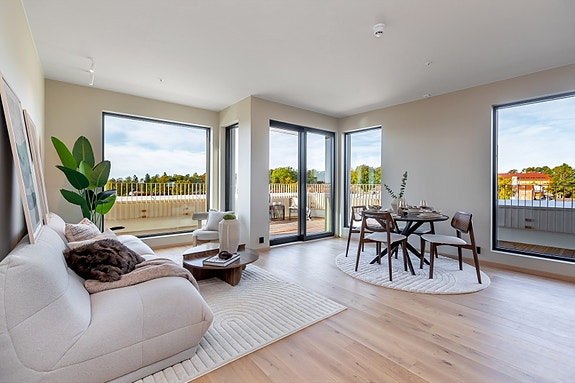Leiligheten ligger i øverste etasje og har en romslig og solrik takterrasse på ca 80 kvm. Heisen ligger like utenfor døren, og går direkte ned i garasjeanlegget. Leiligheten er delikat og har høy standard med gode materialvalg.