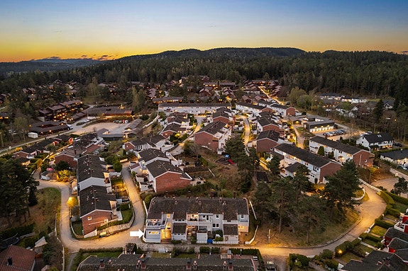 Uteområdet byr på tre ulike soner - markterrasse med skjermet, grønn ramme, solrik takterrasse uten gjenboere eller svalende takterrasse med helt magisk utsikt og orkesterplass til solnedgangene. Det er lekeplass rett ved og ellers rundt på feltet og med boligen følger garasjeplass med muligheter for ladestasjon.