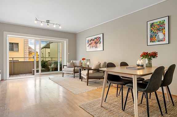 LYS OG ROMSLIG 3-ROMS LEILIGHET I HØY 1.ETG MED STOR BALKONG. Vedfyring. Ingen dok.avigft og lav fellesgjeld. Nært NTNU.