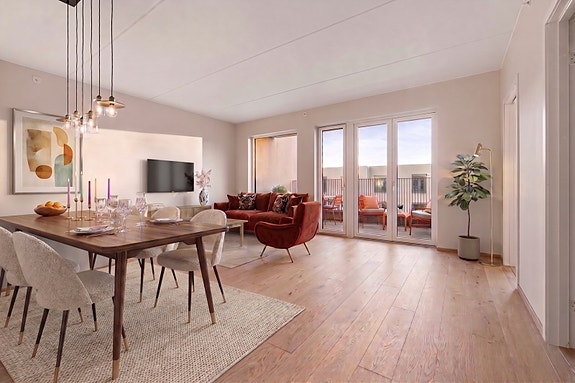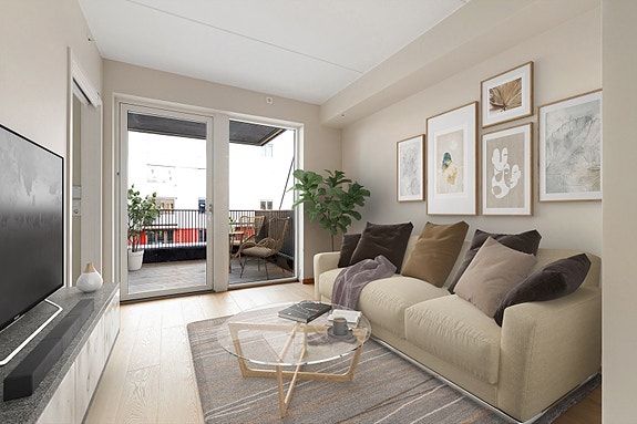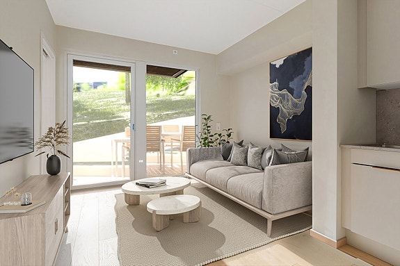 Fra stuen er det utgang til en solrik terrasse vendt mot fellesarealene, med flott utsikt mot blant annet Oslo og fjorden.