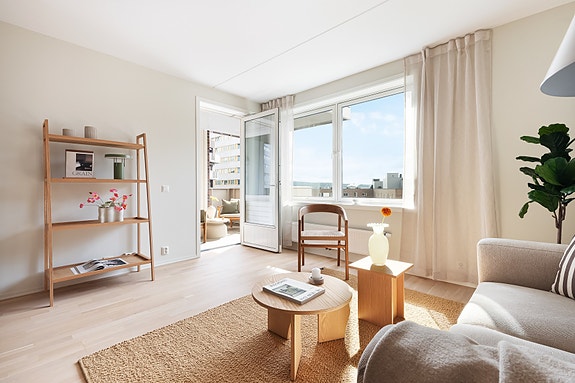 Dette er en lys og innbydende 2-roms leilighet beliggende i 7. etasje i et bygg fra 2012. Her får du gleden av en herlig, sydøstvendt balkong på 8 kvm med hyggelig utsyn mot frodige fellesområdet. Videre er det også en stor takterrasse med spektakulær utsikt og med sol hele dagen.