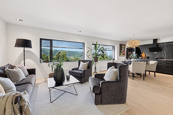 Innholdsrik og moderne 5-roms selveierleilighet | Vedovn | Solrik takterrasse | Utsikt | Garasje | Attraktiv beliggenhet