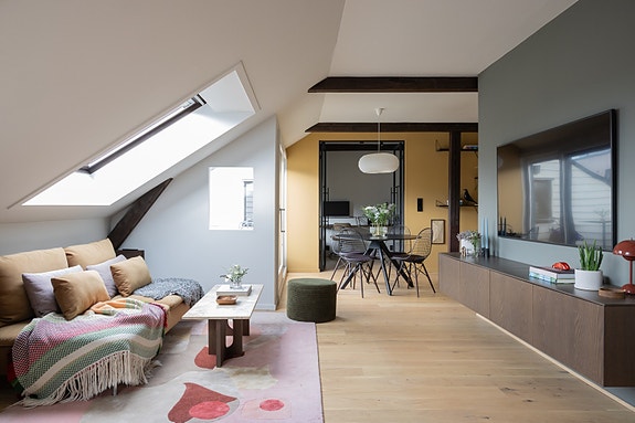 Lys og stilren leilighet i toppetasje med smarte løsninger og helhetlig design tegnet av interiørarkitekt. Store vindusflater gir rikelig med dagslys og en luftig og behagelig atmosfære. Fra stue har du direkte utgang til solrik takterrasse på ca. 7 kvm.