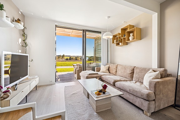 Lys og moderne leilighet over to plan med sørvendt terrasse | Rolig og barnevennlig beliggenhet | Carport og utebod
