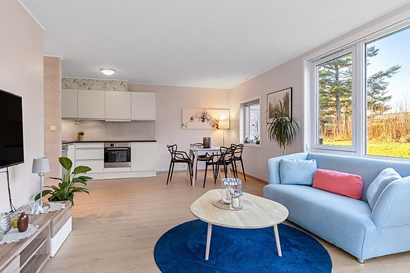 Her finner du en lys og moderne leilighet. Attraktiv beliggenhet i maritime og solrike omgivelser, kun ca. 200 meter fra sjøen. Her bor du med umiddelbar nærhet til flere badestrender og et herlig kystmiljø. Leiligheten ligger i første etasje og har en svært god intern beliggenhet med alt på én flate. Eiendommen befinner seg på ettertraktede Lofterød /Skaustranda, et område mange regner som ett av Sandefjords mest attraktive. Uteplassen er skjermet og usjenert, noe som gir deg mulighet til å nyte rolige stunder utendørs i private omgivelser. Her er det bare å flytte rett inn og ta sommeren i bruk!
