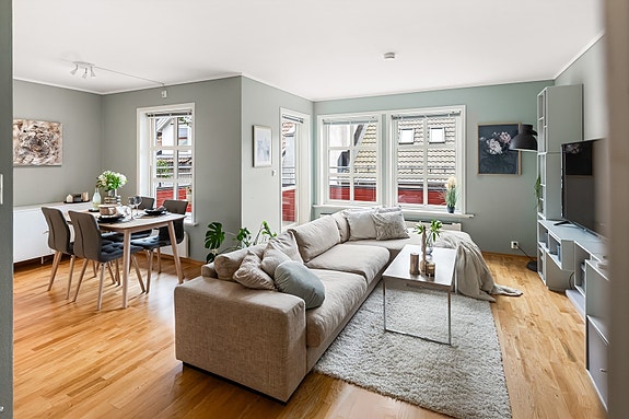 Leiligheten har en arealeffektiv planløsning og er holdt i moderne og tidsriktige farger, noe som gir en fresh og elegant atmosfære.