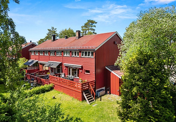 Utbygd enderekkehus på 157m² med 4 sov + kontorrom med vindu. 2 bad. Solrik terrasse med tilgang til grønt fellesareal.
