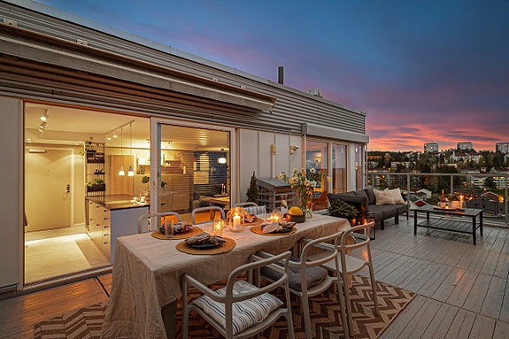 Sjelden anledning! Lys og luftig 4-R med solrik, privat takterrasse på 62 kvm. 3 sov. Nydelig utsikt. Garasje. Heis