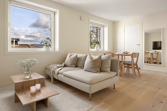 Lys, moderne og lekker 3-roms leilighet med smart planløsning. Denne leiligheten er delvis renovert i 2021 og har nytt lekkert helfliset bad/wc og nytt kjøkken fra 2021. En stavs parkettgulv og nydelige farger på vegger. Rør-i-rør system. Meget god bodplass med 2 romslige boder i kjelleretasjen. Egen parkeringsplass.