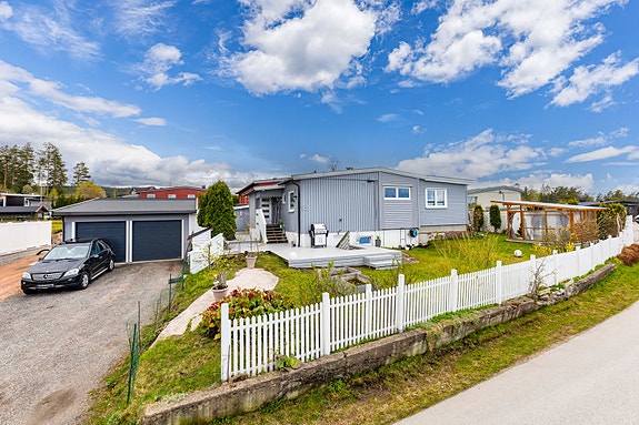 Familiebolig med alt på ett plan, 3(4) sov, dobbelgarasje, flott hage og 3 solrike uteplasser i naturskjønne omgivelser