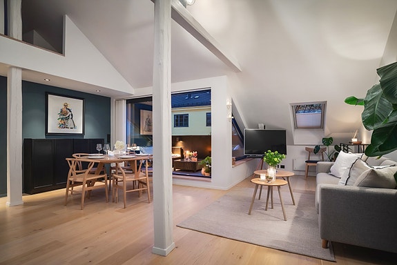 Svært attraktiv og lekker loftsleilighet fra 2010 med solrik, vestvendt takterrasse og peis. Indre gård. Gulvareal 81 m²
