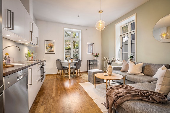 - Entré, bad, stue med åpen løsning til kjøkken og soverom. Tilhørende leiligheten er det ekstern bod i bakgård.