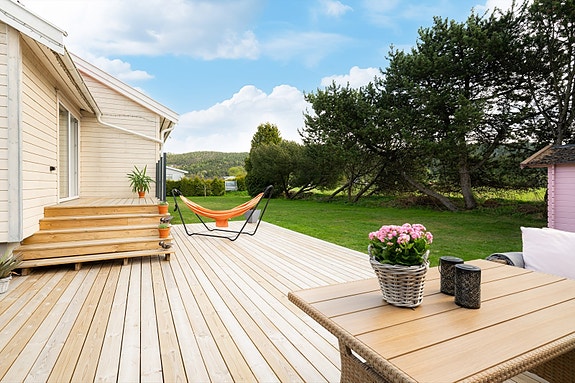 Boligen ligger fint til, i ytterste rekke mot tilliggende jorder, med pent opparbeidet hage og stor, usjenert terrasse.