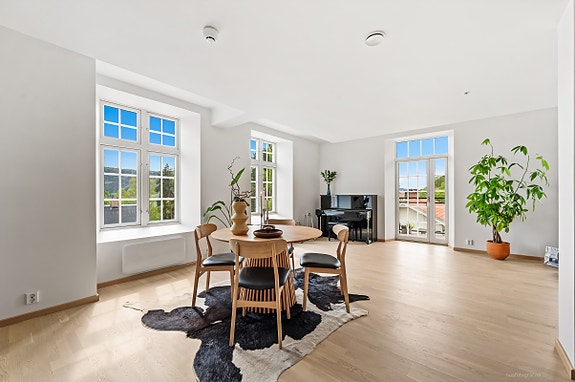 Moderne 4-roms hjørneleilighet. Særegent preg i nyrestaurert historisk bygning. 2 solrike balkonger. Garasje. IN-ord.