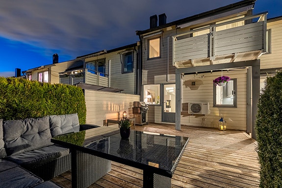 Kjøkkenet er pent og klassisk med integrerte hvitevarer, samt godt med oppbevaringsplass og benkeplass. Stuen oppleves som lys og romslig, med store vindusflater som slipper inn godt med dagslys. Videre har rekkehuset to flislagte bad med gulvvarme, hvorav det ene har opplegg for vaskemaskin. Det er tre soverom og to av rommene er utstyrt med skyvedørsgarderobe. Det er parkering i garasje med elbillader.