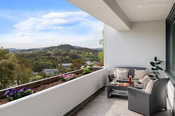 Flott 2-roms med nydelig utsikt og solrik terrasse! Fast parkeringsplass i felles garasje. Varmtvann inkl. i felleskost.