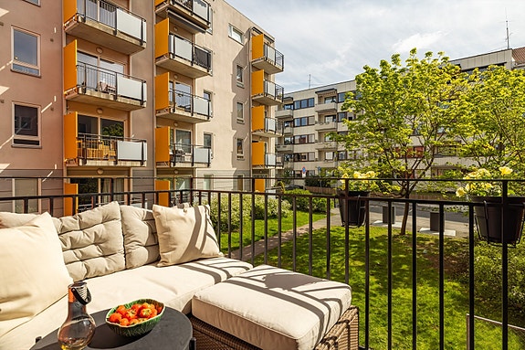 Meget lys og sjarmerende leilighet med lun balkong på 4 kvm i fabrikkbygg. Sovealkove. Kjøkken 2022. IN-ordning.