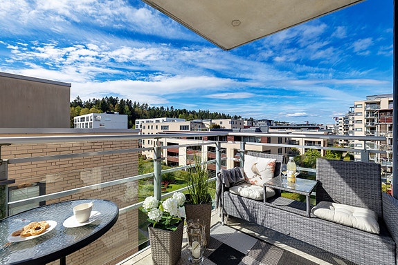 Borettslaget har en flott felles takterrasse med gode solforhold og hyggelig utsikt.