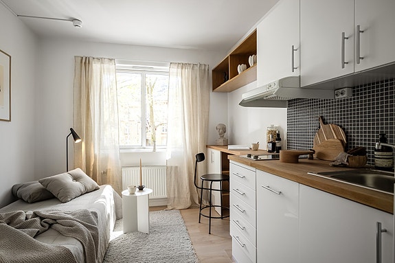 En lys, liten og koselig 1-roms leilighet med attraktiv beliggenhet. Leiligheten ligger i byggets 1. etasje og har en stor vindusflate som slipper inn fint naturlig lys. Normal god standard med laminat på gulv, glatte lysmalte overflater, pent kjøkken med smarte løsninger og flislagt baderom med gulvvarme.