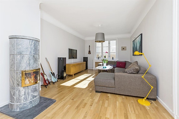 Sentralfyring ( inkludert i fellesutgifter ), samt vedovn i stuen. Det er også varmekabler på baderom og toalett.