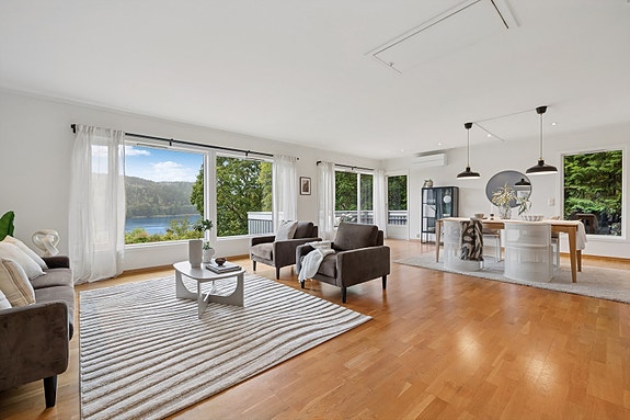 Stuen er lys og åpen med store vindusflater som gir rikelig med naturlig dagslys