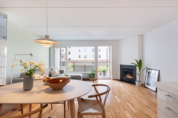 Boligen har en åpen stue og -kjøkkenløsning samt tre romslige soverom, hvorav ett har tilgang til omkledningsrom/bod. Videre får du to flislagte bad og en lys entré med skyvedørsgarderobe.