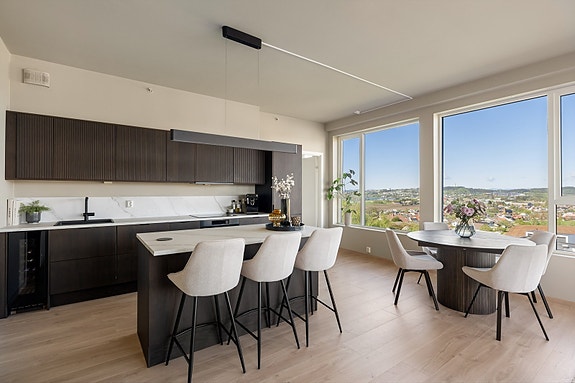 Leiligheten har en gjennomført og innbydende standard, med lyse og romslige oppholdsrom. Stuen fremstår som et naturlig samlingspunkt, med gode lysforhold og flott utsikt. Badet er moderne og stilrent, og det er god planløsning gjennom hele boligen. Fra stuen er det utgang til en stor og solrik terrasse, perfekt for avslapning og sosiale sammenkomster. Leiligheten ligger i et rolig område med nærhet til både natur og sentrale fasiliteter.