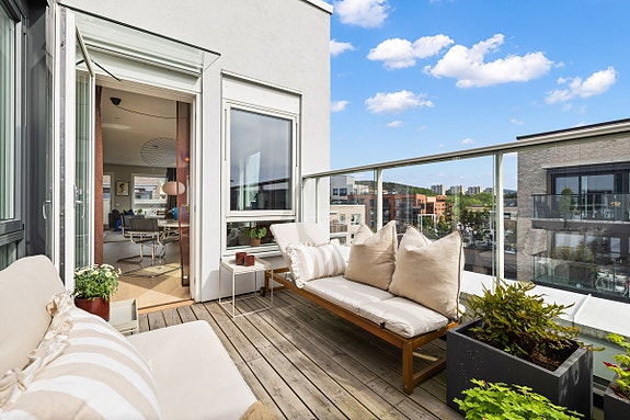 En lys og moderne toppleilighet fra 2022 med både takterrasse og balkong! Leiligheten ligger høyt og usjenert til i 6. etasje med heisadkomst, og byr på en gjennomgående planløsning med god takhøyde, åpen stue- og kjøkkenløsning, to soverom og stilrent bad. Her får du privat takterrasse på ca. 9 kvm, i tillegg til en balkong på ca. 5 kvm. Leiligheten har vannbåren varme, balansert ventilasjon og medfølgende parkeringsplass og bod. Alt dette i et nyere boligområde med grønne uteområder og kort vei til kollektivtransport, skole og handel.